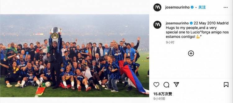穆帅晒出了自己手捧欧冠奖杯和国米团队的图片,并写道:2010年5月22日,马德里。向我的朋友们致以拥抱,特别给卢西奥一个:加油,朋友,我们与你同在!