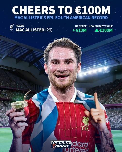 1、麦卡利斯特:1亿欧(24-25赛季,利物浦)